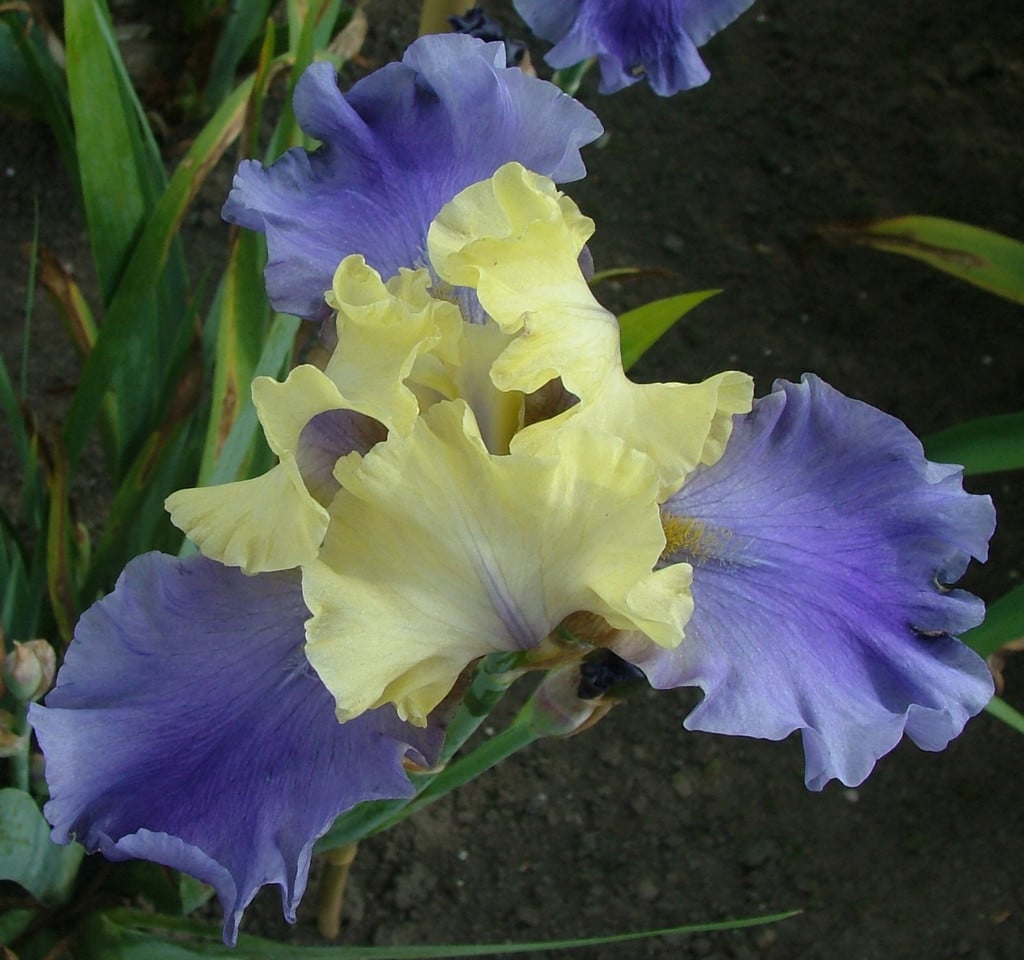 A rhizomatous perennial to 1m tall, with fans of sword-shaped, greyish-green foliage. The highly ruffled flowers, produced in mid-to-late spring, have primrose-yellow standards and blue-violet falls, with orange beards