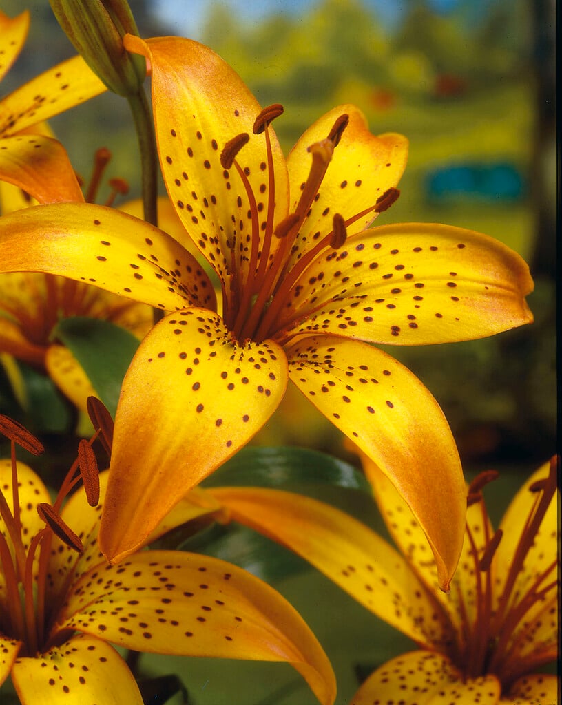 A bulbous perennial, to around 80cm high, with upright stems and lance-shaped, glossy dark green leaves. Large, upward-facing, golden yellow flowers, touched with red at the centre and the edges and speckled with dark brown, are produced in early summer