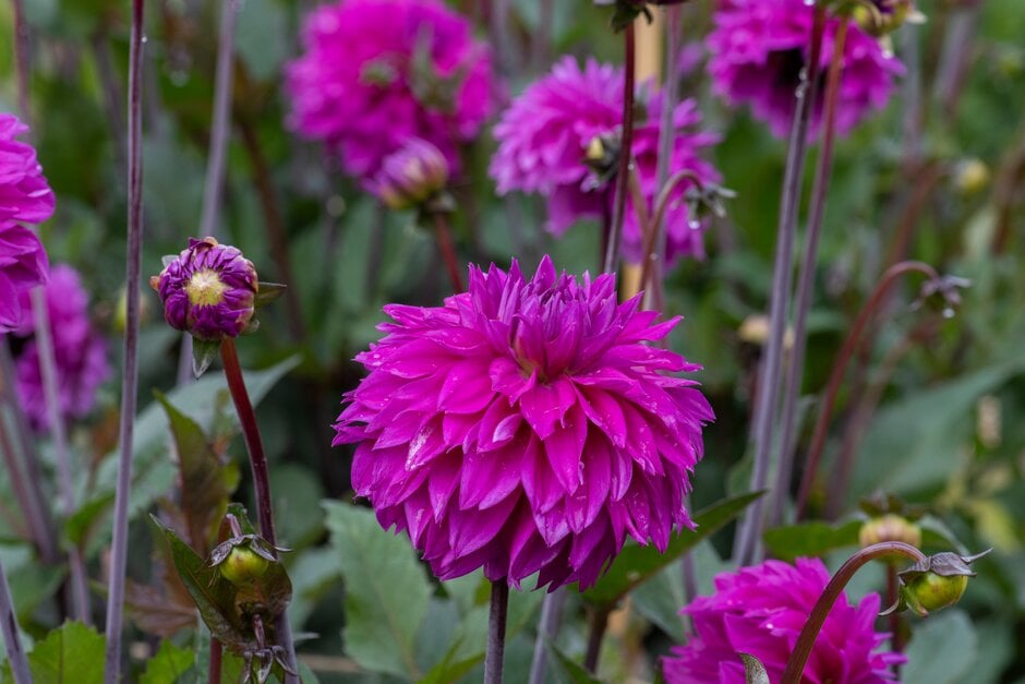 Dahlia are tuberous rooted perennials with pinnately divided leaves and showy flowerheads, double in many cultivars, in summer and autumn