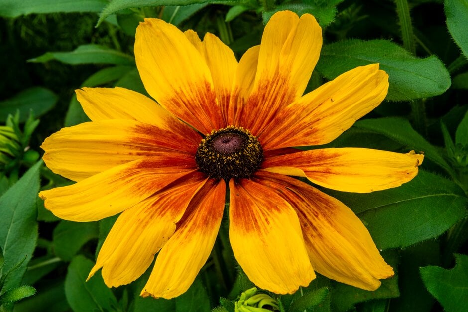 Rudbeckia may be annuals, biennials or rhizomatous herbaceous perennials, with simple or pinnately divided leaves and large daisy-like flower-heads with yellow or orange rays surrounding a prominent conical disk