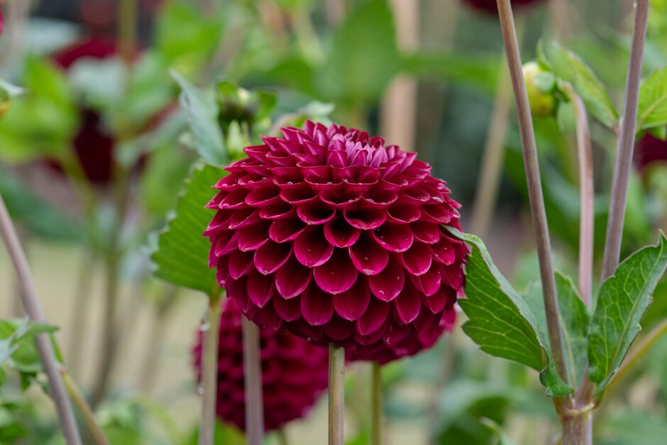 A strong, clump-forming, bushy tuberous perennial to around 120cm in height, with dark green serrated leaves. Dark red pompom-shaped flowers with faint, white-tipped petals, appear from summer through until the first frosts