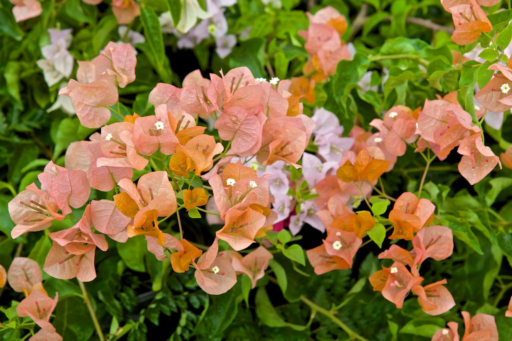 A frost-tender, evergreen climber with ovate leaves and clusters of small white flowers surrounded by papery rose-pink to soft orange bracts in summer