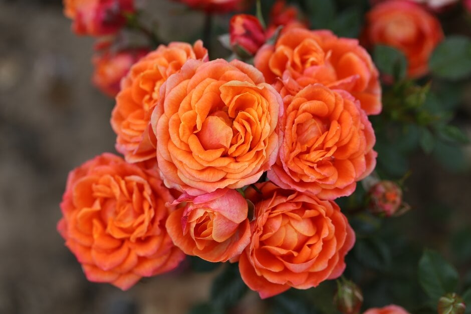 Compact rose about 45cm tall, with healthy dark green leaves and bearing masses of lightly scented, fully double orange blooms borne in clusters, repeat-flowering all summer into autumn; tolerant of some shade