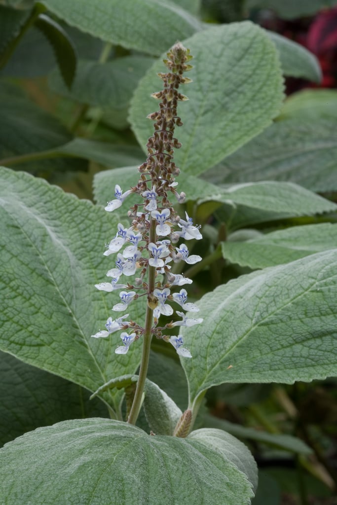 A tender, evergreen, sub-shrubby perennial to 60cm tall, grown for its velvety, silver foliage. In summer, slender, purple inflorescences are produced; these bear small, blue-tinted white flowers