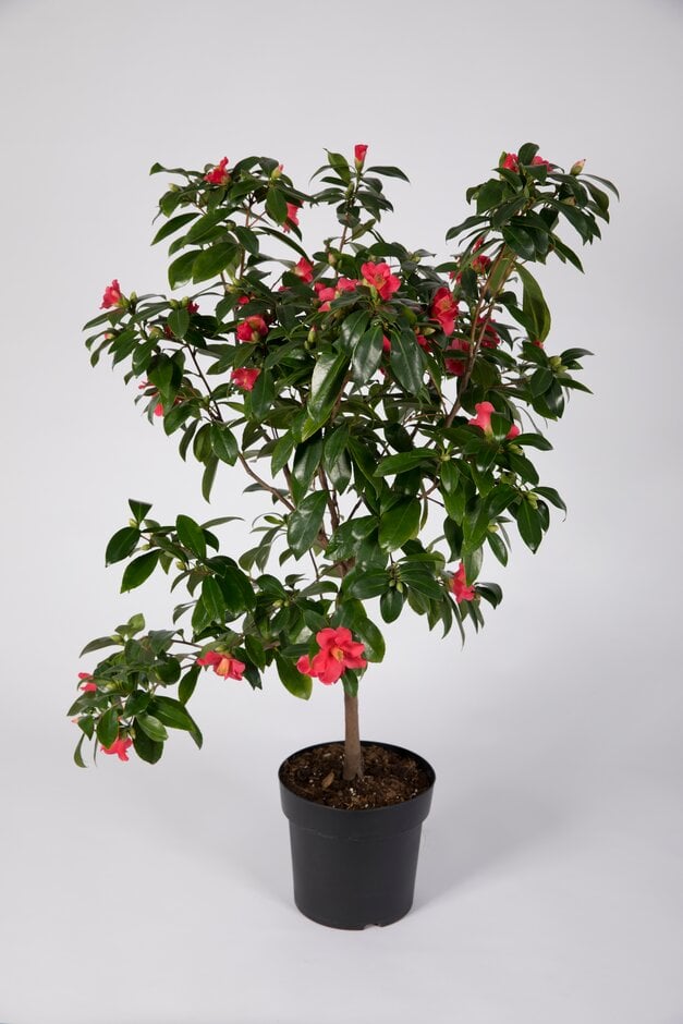 A dense, compact evergreen shrub with dark green, glossy leaves. Tight rose-like buds open to masses of single, bright red flowers which appear in summer and autumn. Can be placed in some sun but prefers a shady position