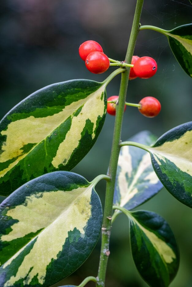 Vigorous, evergreen shrub or tree to a height of 4m. The almost spineless leaves are deep green with striking yellow splashes. Self-pollinating, so after the clusters of small white flowers appear in late spring, heavy crops of large red berries are borne in autumn; a male pollinator may increase the yield