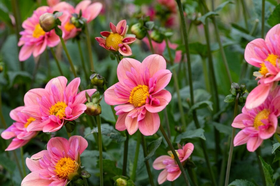 Dahlia are tuberous rooted perennials with pinnately divided leaves and showy flowerheads, double in many cultivars, in summer and autumn