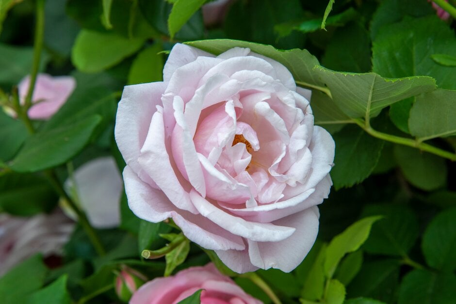 Rosa can be deciduous or semi-evergreen shrubs or scrambling climbers, with usually thorny stems bearing compound pinnate leaves and solitary or clustered flowers. Flowers may be followed by showy red or purple fruits in some varieties.