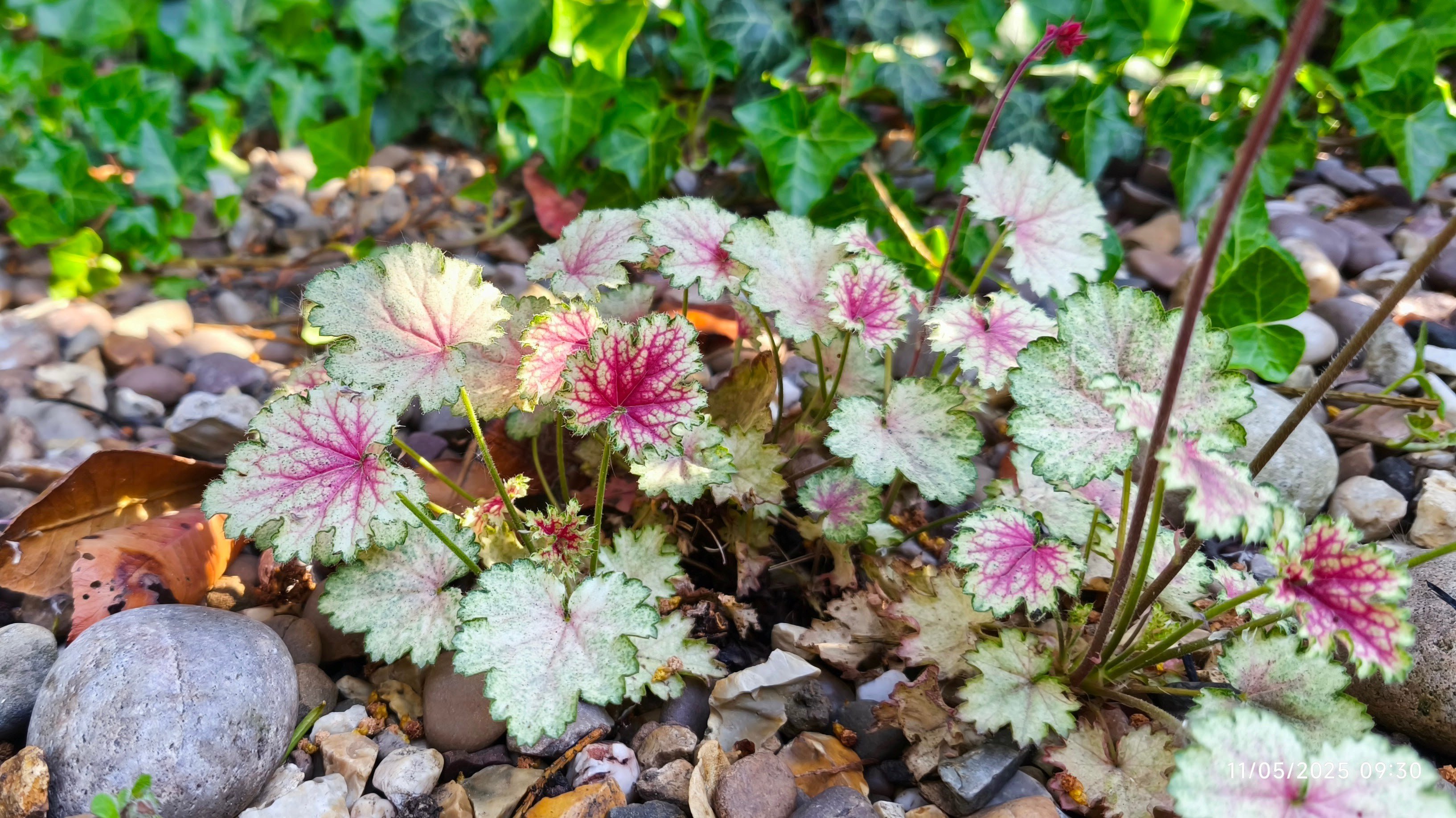 A quick-growing, clump-forming evergreen to semi-evergreen perennial to around 30cm in height, with unusual pale green and creamy-white foliage with burgundy red central veining, giving it a marbled effect. Pink flowers appear above the foliage in summer