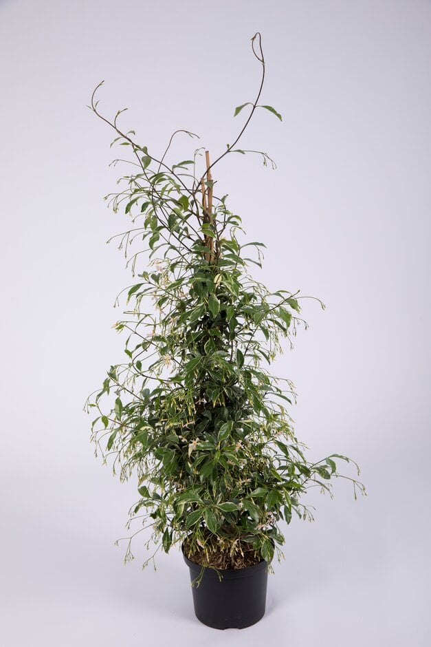 A woody, evergreen, twining climber about 3m in height, with oval, variegated glossy green leaves with a cream edge. Masses of sweetly-scented, starry pink flowers appear above the foliage from May to September