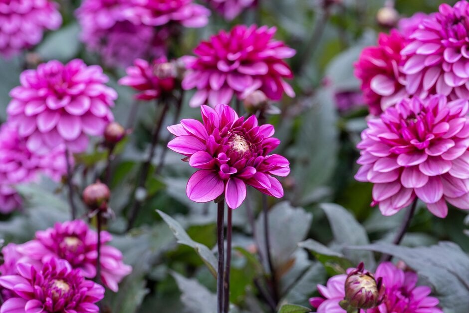 Dahlia are tuberous rooted perennials with pinnately divided leaves and showy flowerheads, double in many cultivars, in summer and autumn
