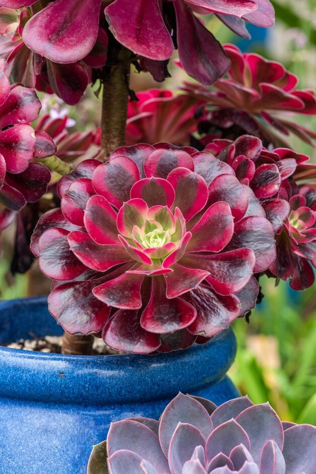 Aeonium are evergreen succulents often of shrubby habit, with fleshy leaves in terminal rosettes on the shoots, and racemes or panicles of small, star-shaped flowers with numerous narrow petals