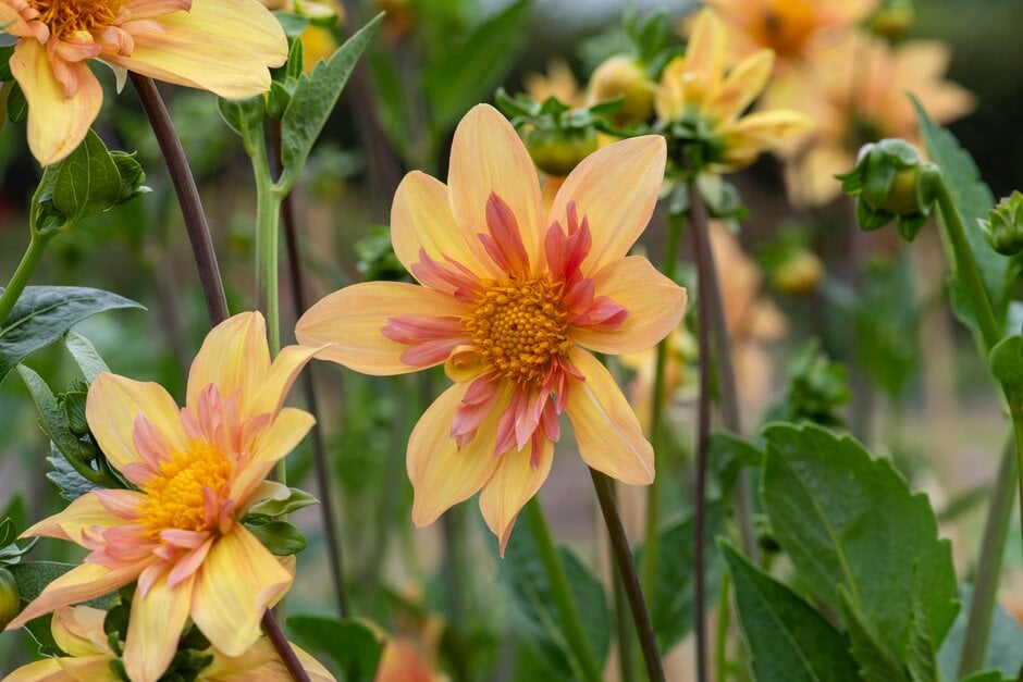 Grow in fertile, humus-rich, well-drained soil enriched with organic matter, in full sun. Pinch out growing tips to encourage bushy plants and stake - see staking perennials. Water if needed in dry periods. Lift and store tubers in autumn to replant, or use as a source of cuttings, in spring. See dahlia cultivation and our video How to plant dahlia tubers and care tips