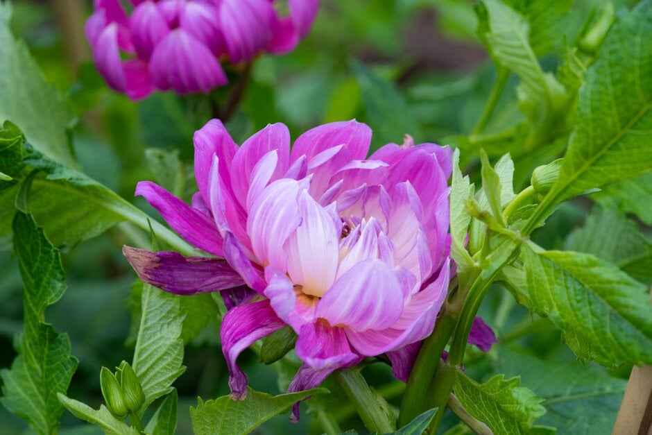 Grow in fertile, humus-rich, well-drained soil enriched with organic matter, in full sun. Pinch out growing tips to encourage bushy plants and stake - see staking perennials. Water if needed in dry periods. Lift and store tubers in autumn to replant, or use as a source of cuttings, in spring. See dahlia cultivation and our video How to plant dahlia tubers and care tips