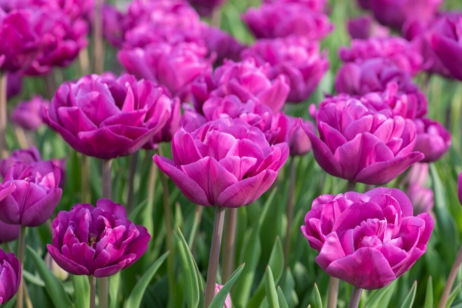 Double Late Group tulips flower in late spring, with large, fully double flowers, sometimes with a margin of a different colour