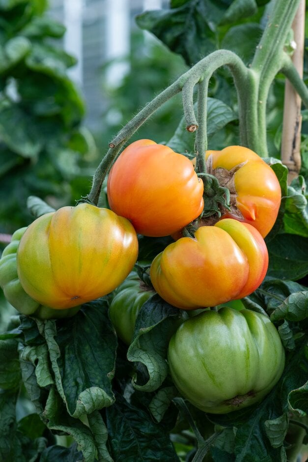 An easy-to-grow heirloom cordon variety to around 200cm in height with green leaves. Slightly flat, thick, meaty, juicy and sweet yellow and orange-streaked fruits with a hint of acidity weigh up to 500g and have few seeds. Harvest from July through to October. Best grown outdoors, but will produce ripe fruits earlier if grown in a greenhouse