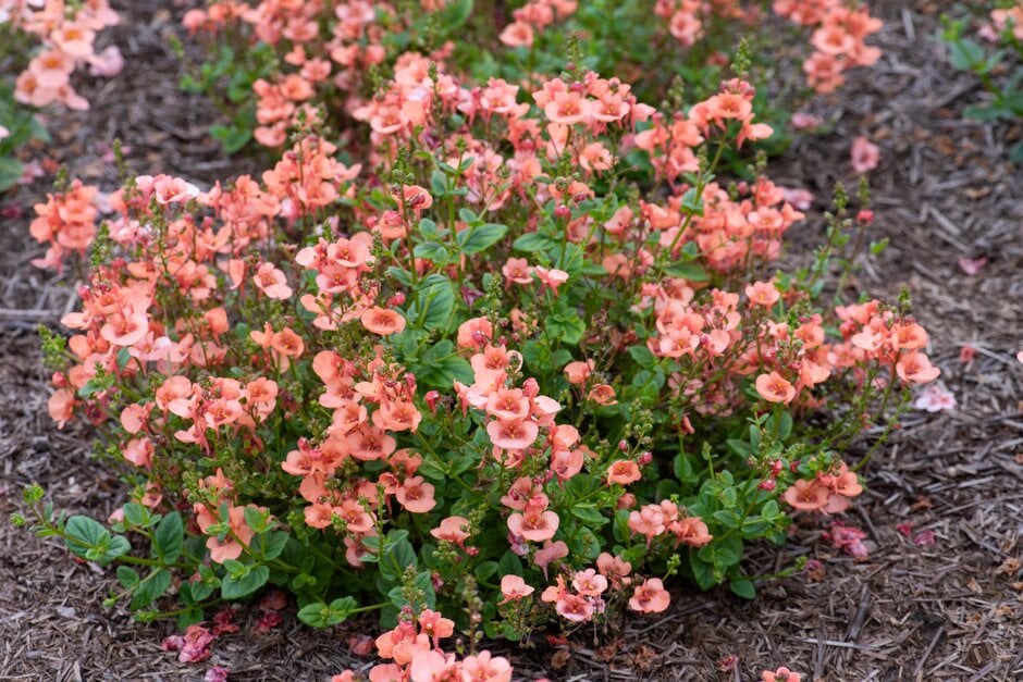 Diascia can be annuals or semi-evergreen perennials, usually making a mat of neat foliage with racemes of cup or bell-shaped flowers, usually in shades of pink, and each with two short spurs