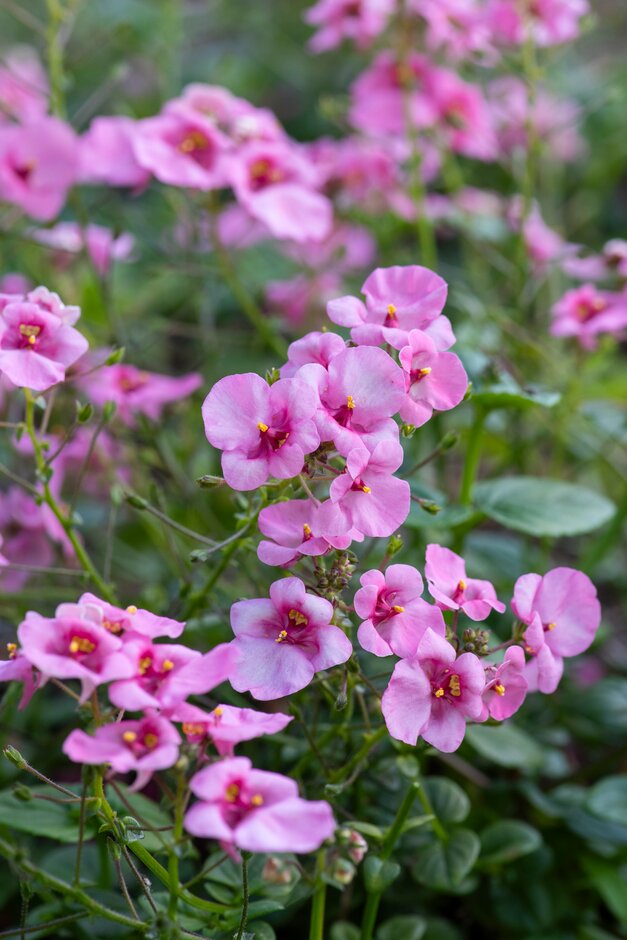 Diascia can be annuals or semi-evergreen perennials, usually making a mat of neat foliage with racemes of cup or bell-shaped flowers, usually in shades of pink, and each with two short spurs