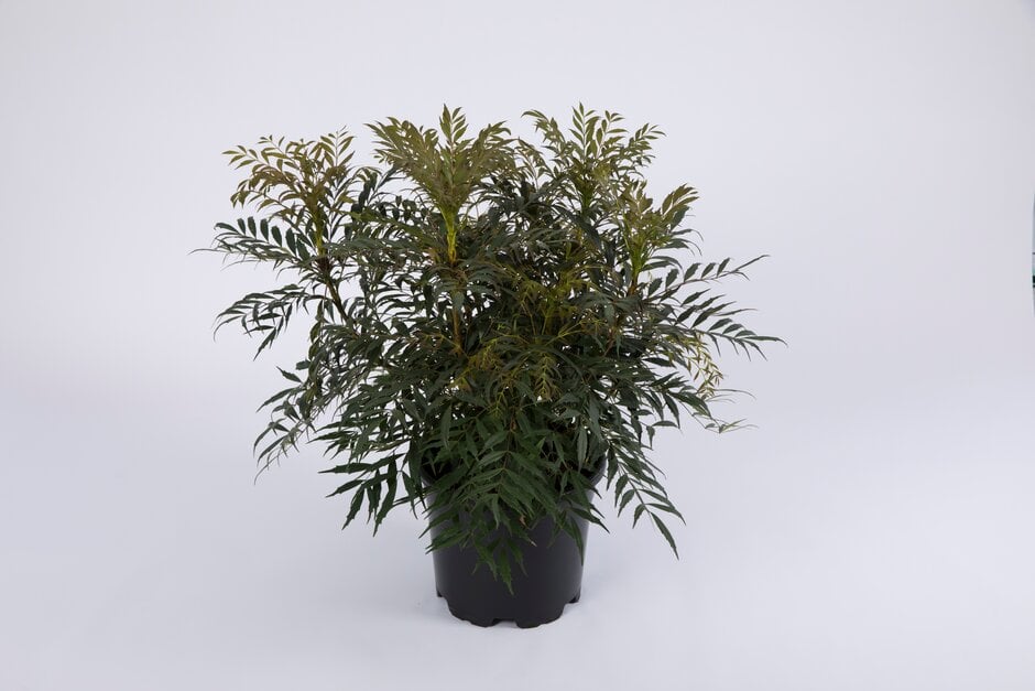 A compact upright, evergreen shrub to around 125cm in height, with narrow, spine-free foliage which emerges bright red in the spring and summer, turning to dark green as the season progresses. Large, honey-scented yellow flower spikes appear from August through to November followed by blue-black berries