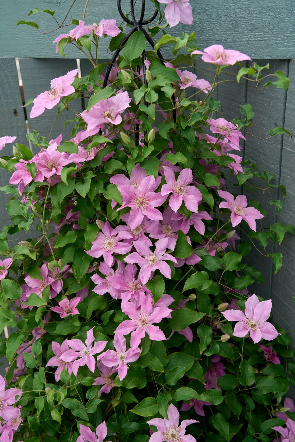 A bushy, compact, deciduous perennial climber to around 120m in height, with dark green leaves. Masses of large, soft pink flowers with pointed tips, crimped edges and red anthers appear from June to September, covering the stems fully for a beautiful display