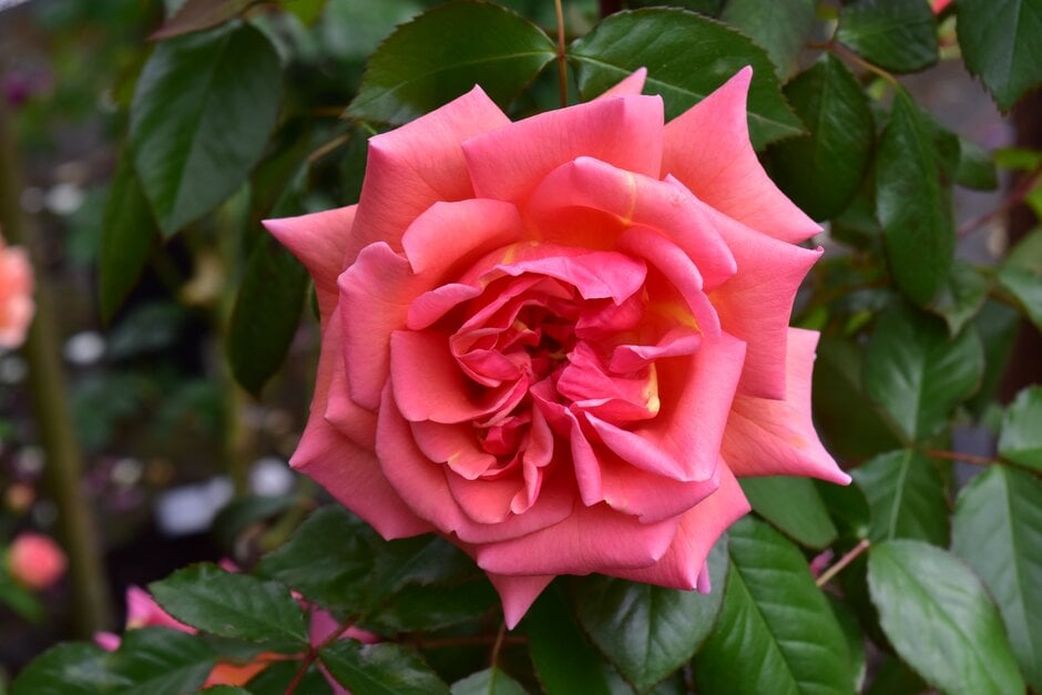 Rosa can be deciduous or semi-evergreen shrubs or scrambling climbers, with usually thorny stems bearing compound pinnate leaves and solitary or clustered flowers. Flowers may be followed by showy red or purple fruits in some varieties.