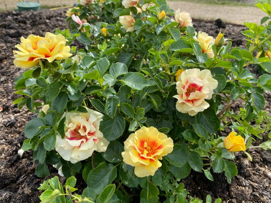 A compact, upright, bushy floribunda shrub rose to around 80cm in height, with dark green foliage. Semi-double to double, mildly fragrant, creamy-yellow flowers with a red centre appear from summer to autumn