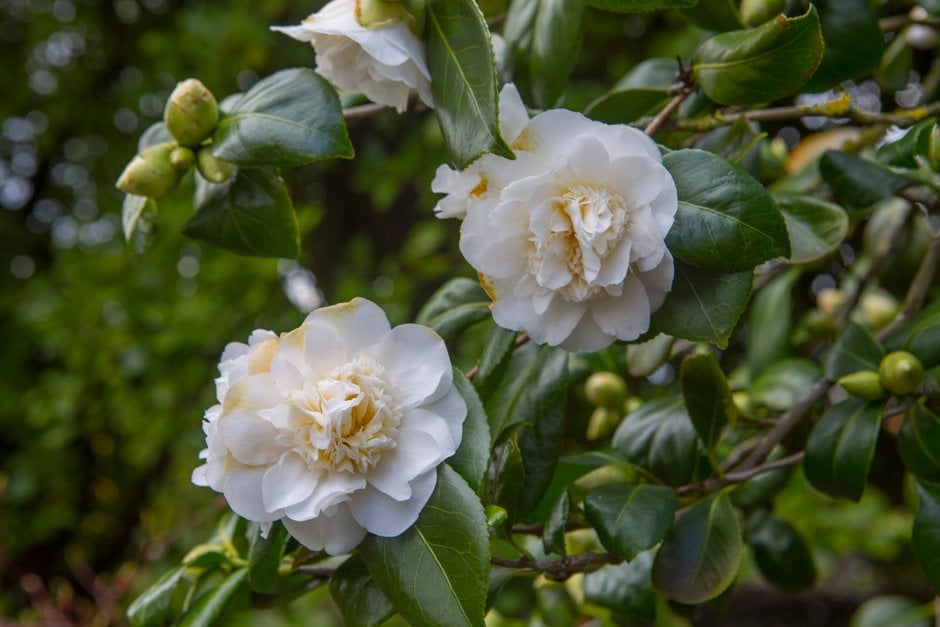 Camellia are evergreen shrubs with simple, ovate, glossy, leathery leaves and showy flowers with solitary or clustered flowers early in the year