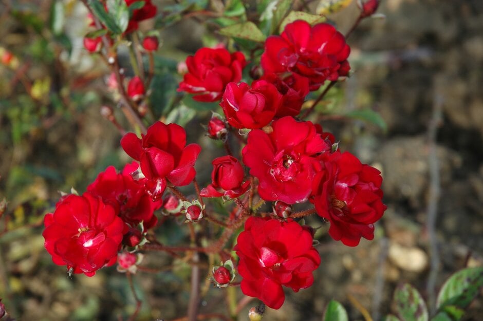 Small, compact bushy rose about 60cm tall and wide, with dark green leaves and slightly paler stems. Small, slightly scented, globular, semi-double scarlet-crimson blooms in large trusses, open flattish, repeat-flower from early summer to autumn