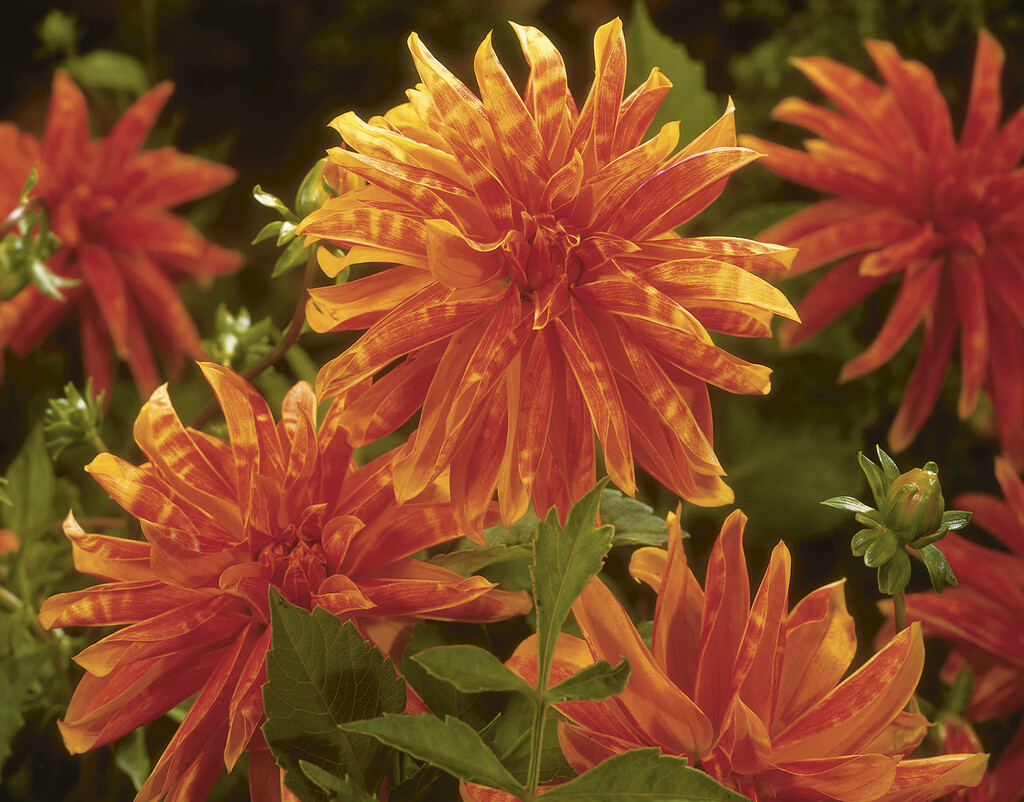 Dahlia are tuberous rooted perennials with pinnately divided leaves and showy flowerheads, double in many cultivars, in summer and autumn