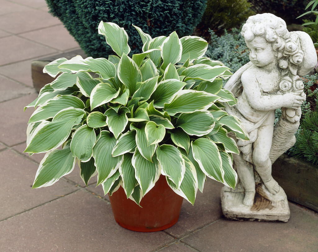Hosta are clump-forming herbaceous perennials with simple, ovate or lance-shaped leaves, often attractively coloured or variegated, and erect racemes of nodding, funnel or bell-shaped flowers in early summer