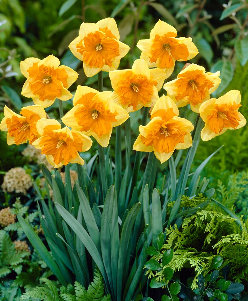 A clump-forming daffodil to around 45cm high, with straplike, grey-green leaves. Flowers are 10.5cm across, with light yellow outer petals and a frilly orange corona, split to the base and held flat against the petals