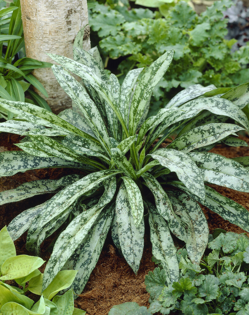 Pulmonaria can be herbaceous or semi-evergreen rhizomatous perennials with terminal clusters of funnel-shaped flowers in late winter or early spring, and often strikingly patterned leaves developing in summer