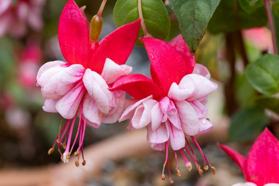 Fuchsia can be deciduous or evergreen shrubs or trees, rarely perennials, with opposite or whorled leaves and usually pendent flowers with conspicuous tubular calyx, 4 spreading sepals and 4 erect petals