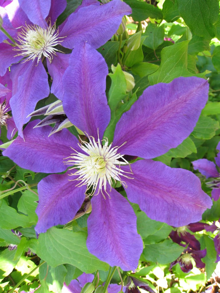A climber 1.5-2m high with green leaves and flowers, 10-15cm across, composed of six to eight purple sepals with reddish maroon bars, and cream-yellow anthers on green-white filaments, in early summer and again in late summer and autumn; many clematis are visited by bees for pollen, and some also provide nectar
