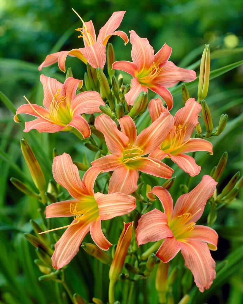 Hemerocallis may be evergreen or herbaceous perennials, with narrow, strap-shaped leaves and funnel-shaped flowers on erect stems in late spring or early summer