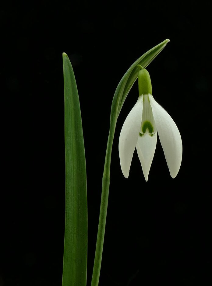 Galanthus are dwarf bulbous perennials with linear or strap-shaped leaves, and solitary, often honey-scented, nodding flowers with 3 white outer tepals and 3 smaller inner ones often marked with green