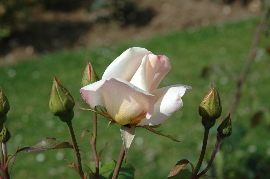 Rosa can be deciduous or semi-evergreen shrubs or scrambling climbers, with usually thorny stems bearing compound pinnate leaves and solitary or clustered flowers. Flowers may be followed by showy red or purple fruits in some varieties.
