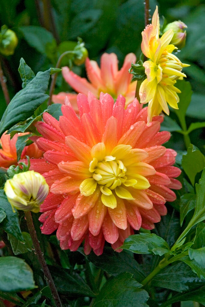 Dahlia are tuberous rooted perennials with pinnately divided leaves and showy flowerheads, double in many cultivars, in summer and autumn