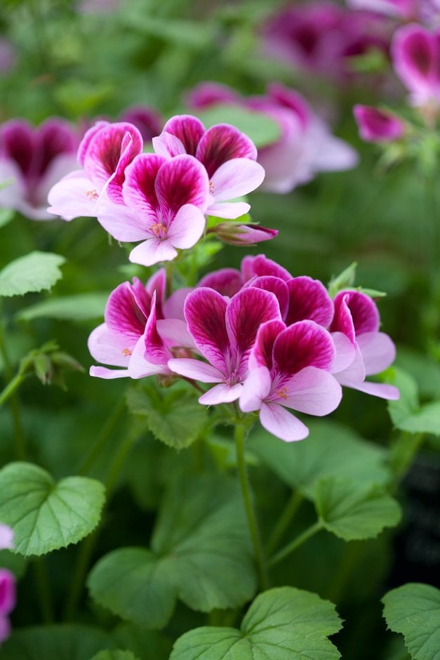 Angel pelargoniums are compact, bushy perennials with small, rounded leaves, sometimes scented, and clusters of small single flowers in shades of pink, red purple or white