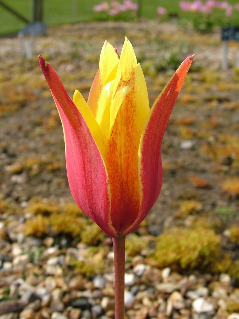 A dwarf perennial bulb, to 30cm tall, with glaucous-green narrow leaves. Flowers red with yellow margins, yellow inside, appearing in mid spring