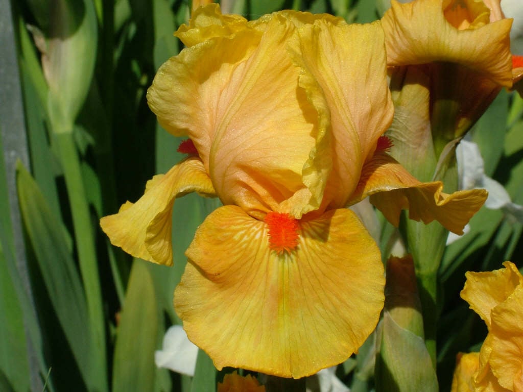 'Sunny Dawn' is a vigorous plant with grey-green foliage and stems to 60cm tall, bearing up to four light orange-yellow flowers in late spring, the standards pale orange-yellow, the falls slightly deeper in coour, with a bright orange beard,