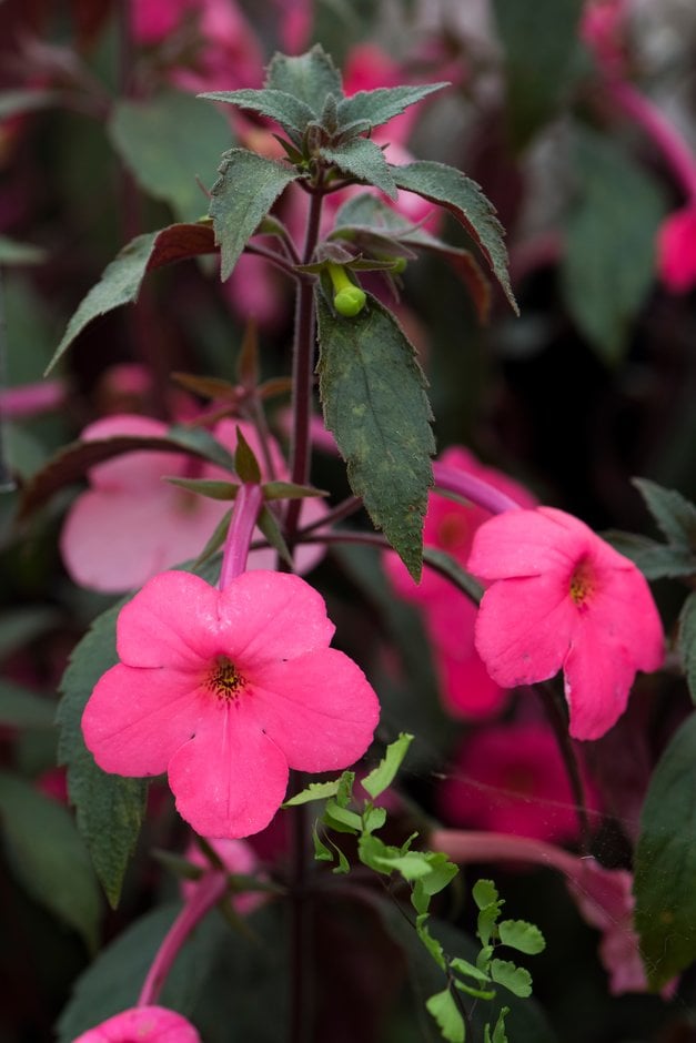 Achimenes are rhizomatous herbaceous perennials with scaly rhizomes producing trailing stems bearing simple, opposite or whorled leaves and salver-shaped showy flowers in the leaf axils in summer and autumn