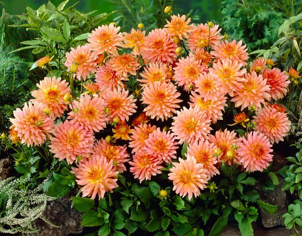 Tuberous-rooted perennial to about 1m tall, with dark green foliage. Large, semi-cactus flowers, up to 20cm across, produced from mid-summer until the first frosts, are orange or salmon-pink, flushed yellow towards the centre of the long, pointed petals, that are rolled under at the edges, giving a spiky effect