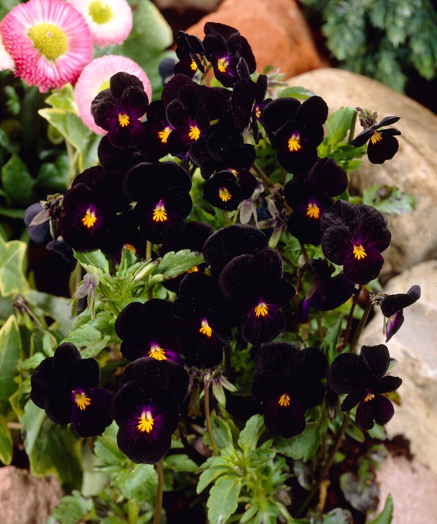 A compact, clump-forming evergreen perennial with green foliage and velvety very dark purple to almost black flowers with a bright yellow eye, appearing over a long period from March through to October