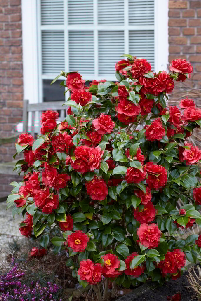 Camellia are evergreen shrubs with simple, ovate, glossy, leathery leaves and showy flowers with solitary or clustered flowers early in the year