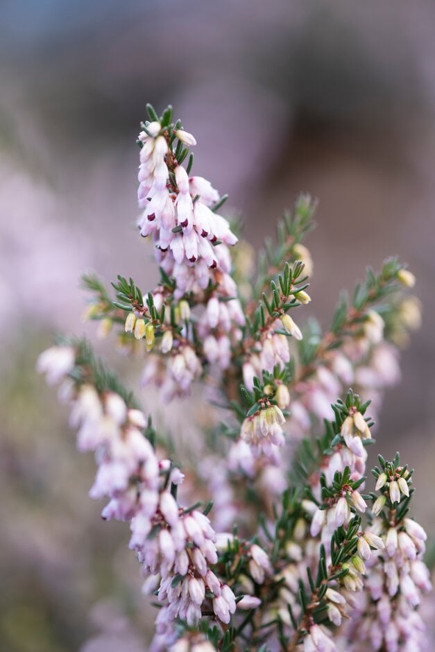 Erica can be prostrate or erect, evergreen shrubs with fine, needle-like leaves in whorls, and racemes or panicles of small, bell-shaped or tubular flowers