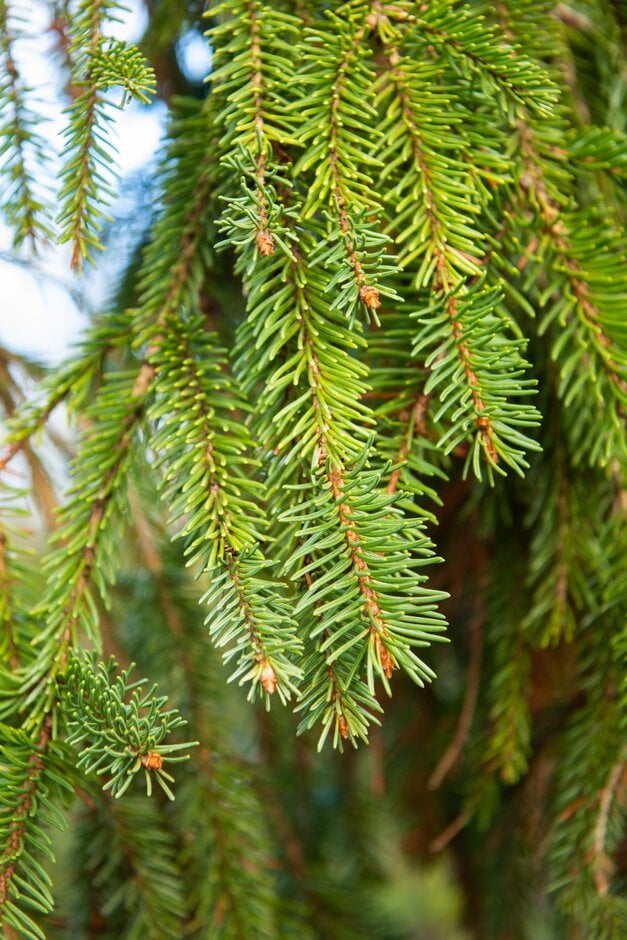 Picea are evergreen trees with rigid, needle-like leaves arranged singly all round the shoots, and narrow, leathery-scaled cones borne near the ends of the shoots