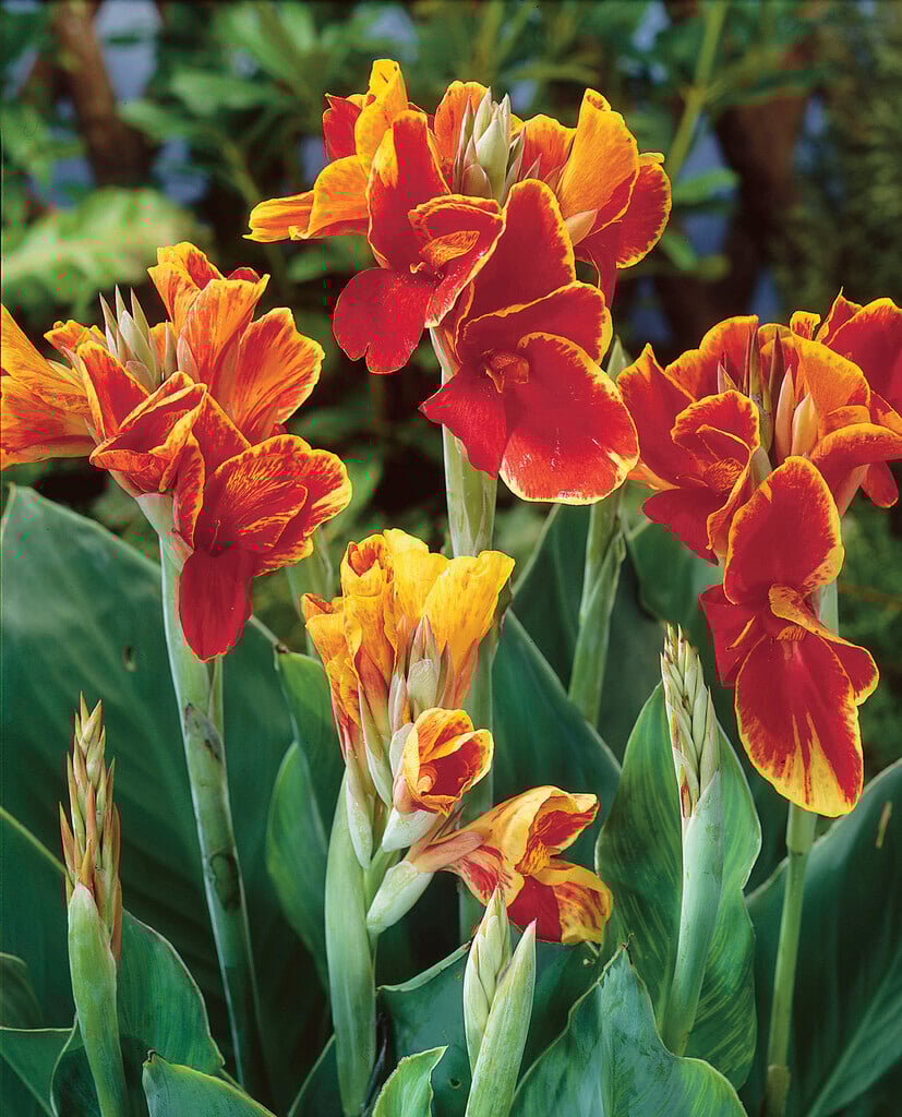 Canna are rhizomatous herbaceous perennials with erect stems bearing ovate leaves, with showy flowers with showy petal-like staminodes and small, coloured petals and sepals, borne in racemes or panicles in summer and autumn