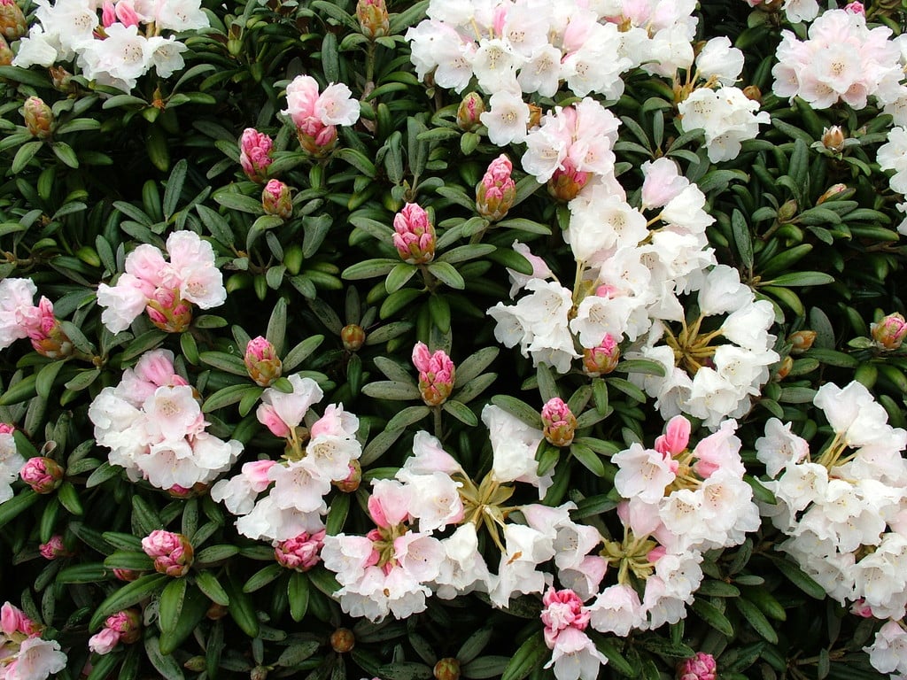 A low-growing evergreen shrub forming a compact mound, to 80cm tall. Leaves felted greenish-white on the upper surface and creamy-brown beneath. Dome-shaped trusses of white, wavy-edged flowers, with some yellowish-green spots in the throat, open from pink flower buds in late spring