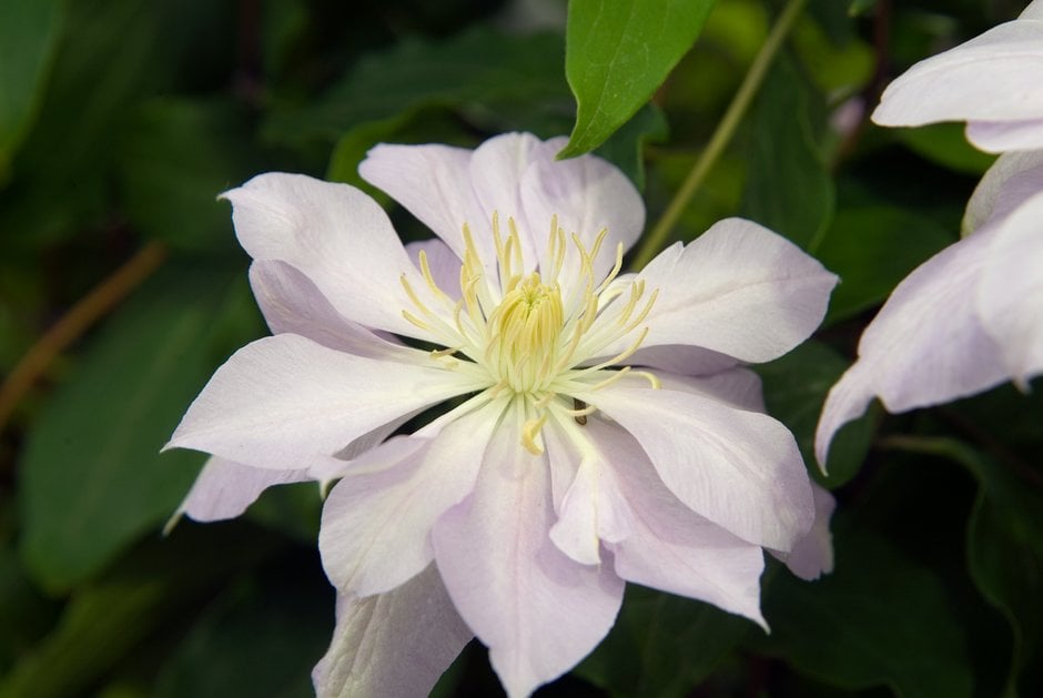 A deciduous climber to 2m tall bearing double to semi-double pale lavender blooms that fade to white with a hint of blue. Flowers reach up to14cm in diameter and are borne in early summer and then again from late summer into early autumn